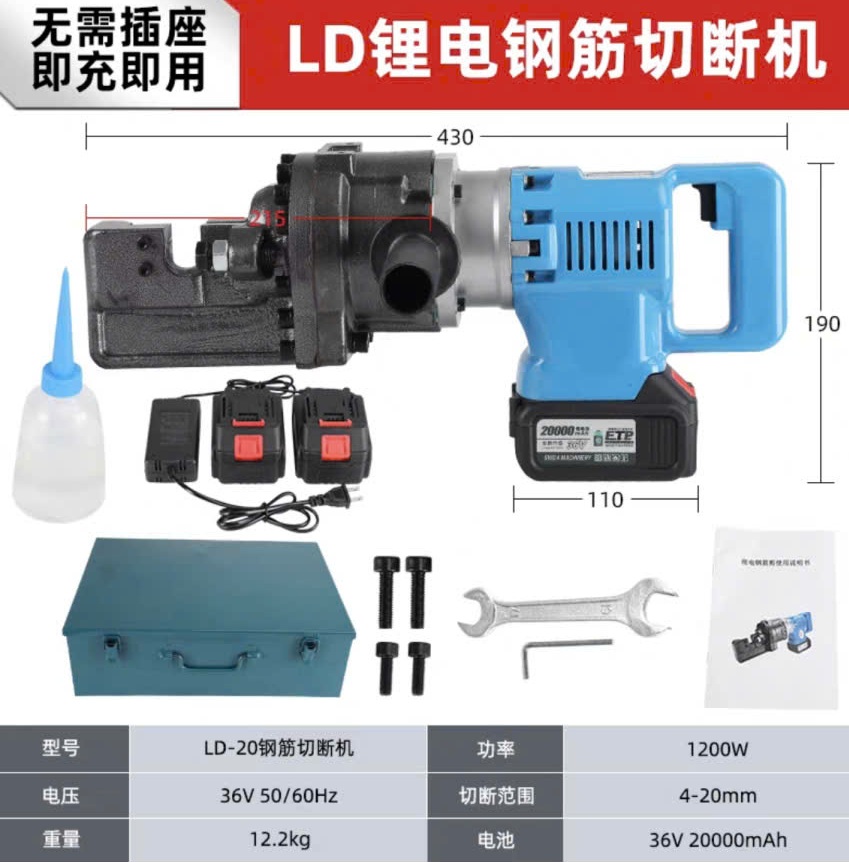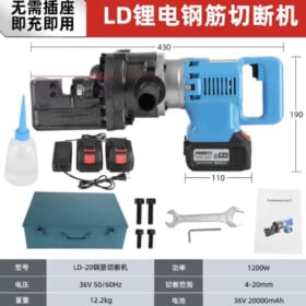 Máy cắt sắt thủy lực cầm tay dùng pin, với công suất động cơ lớn lên đến 1200W, sử dụng viên Pin mạnh mẽ 36V 20000 mAh, dùng để cắt đứt nhanh chóng các thanh sắt có kích thước từ 4-20 mm (Ø4 – Ø20)